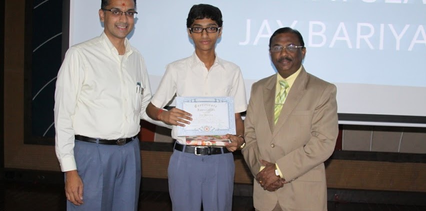 We are very happy to announce that from the high school category, Jaybhai Bariya, a student of 11th Science from our school was declared a winner by the MHRD. His winning essay can be found here. A felicitation ceremony was organized in the school auditorium on 9th of September. Principal Mr Anthony of J. H. Ambani School was the chief guest of the function. He awarded Master Jay Bariya with a certificate, a book gift and a cash prize of Rs. 5,000 sent by MHRD, India. Mr Anthony on this occasion also shared his experience with the students of the school, highlighting the importance that teachers play in the life of the students.