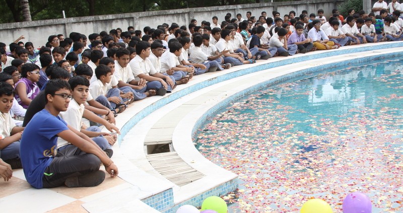 India is blessed with the delightful celebrations, not only fun-filling in life but also spiritually inspiring. Each festival has its own space and significance in India.One amongst many such festivals, was celebrated at Atmiya Vidya Mandir on 5th September, 2014. Resembling the purification process of body, mind and soul, it is named as Jal Jhilani Ekadashi, one of the most auspicious festival of Hinduism. The celebration took place at school’s swimming pool, wherein the whole school was present, from every elderly person to the youngest one.