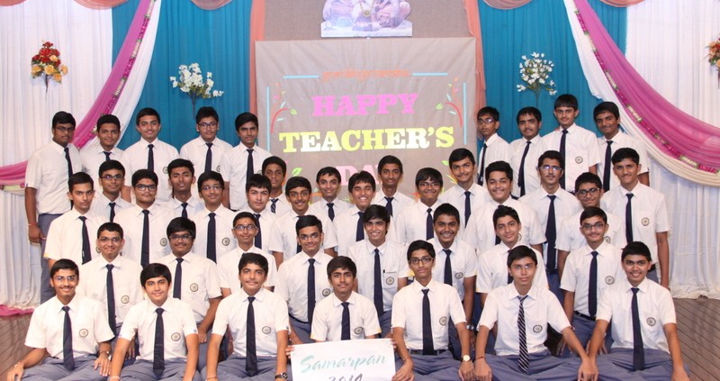 As soon as the mid-terms got over, the entire grade (both science and commerce classes combined) went into a discussion spree. The students were very enthusiastic and worked very hard for the preparation of function. They meticulously planned the details of the function and were even worked till late in the night. Their hard work and coordination made it possible to have all the planned tasks executed successfully in very less time. But the most remarkable thing was that the entire standard worked together as ONE unit.The 5th September event kick started with a gracious welcome of the teachers by students doing their poojan right at the entrance of the hall. The event hosts, Uttambhai Italiya (11 Science) and Deepbhai Chamaria (11 Commerce) then invited the dignitaries for lighting of the ceremonial lamp by the. For the understanding of all that were present, the hosts presented a very enlightening video of Lord Krishna in which He defined the true meaning of ‘Samarpan’.Thereafter, a heartfelt musical tribute was offered by Anandbhai Pandya (11 Science) and Abhishekbhai Mandaviya (11 Commerce). To further add charm to the musical saga, we had students from grade 10 to express their gratitude through a melodious song.We then had glimpses of some beautiful moments that our beloved teachers have spent with the students. Moreover, a surprise element was added to this celebration for the first time: video tribute with students (past and present) expressing their feelings about teachers.